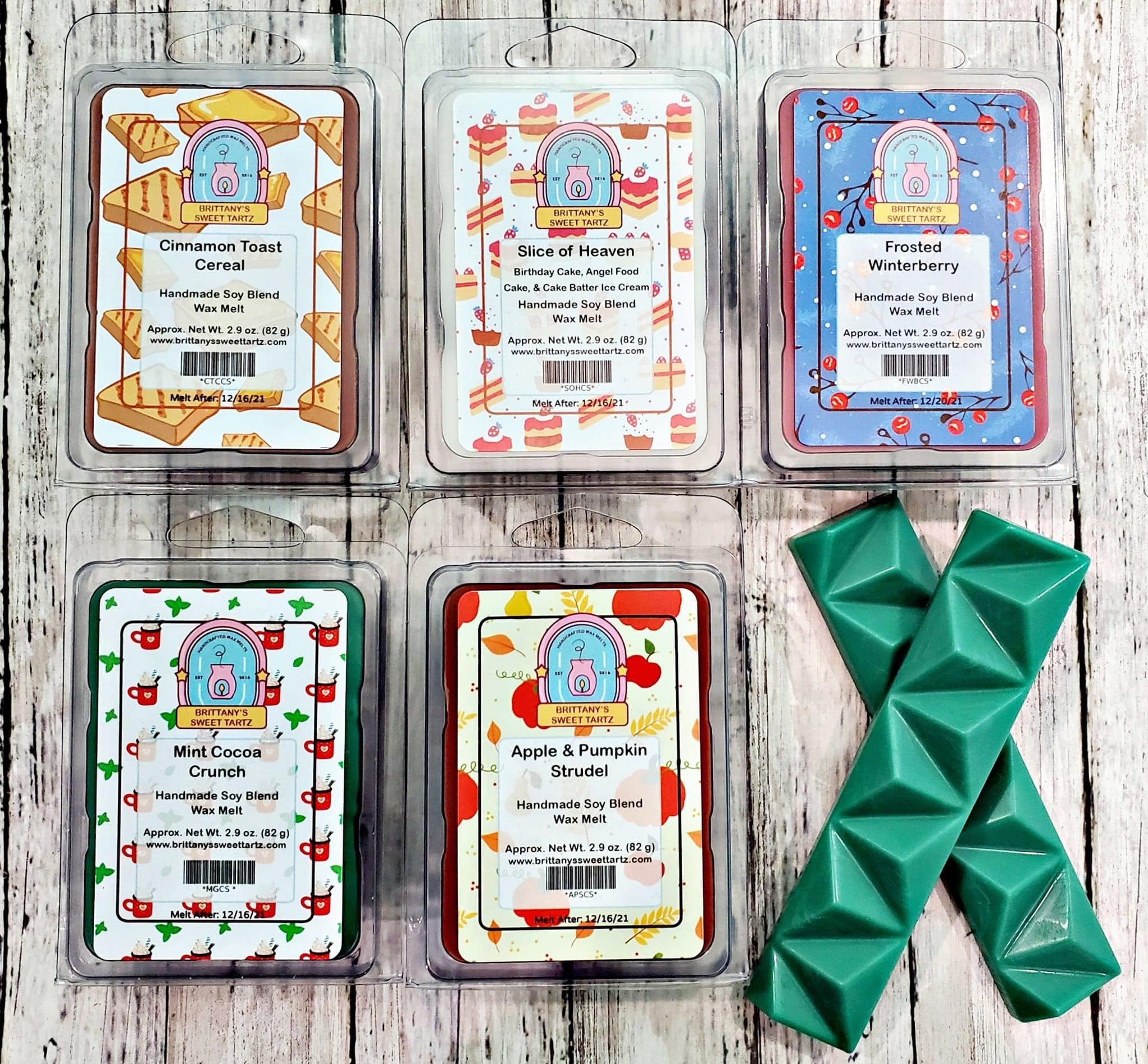 After talking to the owner of Brittany’s, we discussed that she’d like to do something fun, cute, and unique, kind of like her product, say no more! After a few rounds we settled on the cute/kawaii style icon logo with the old fashioned tart warmer graphic. Next to come was the challenge of creating packaging that was equally as fun, and that would be able to work no matter what the scent was. Previously she had been using images of fruit , florals or food to represent what the scent was. Here are the old labels.